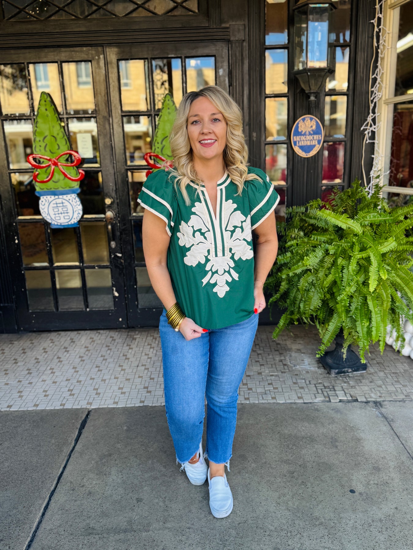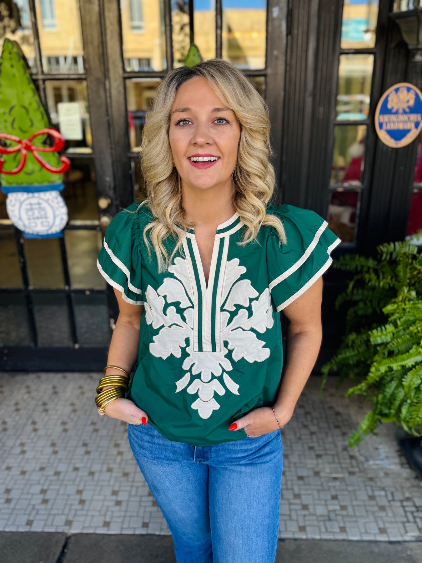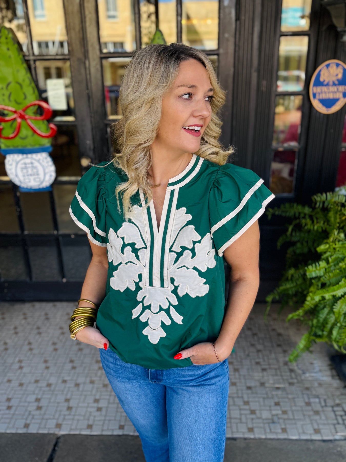 The Pine Breeze Blouse combines timeless elegance with contemporary flair. This sophisticated piece features a rich pine green base complemented by delicate flutter cream sleeves that add graceful movement. A striking cream paisley pattern adorns the center, creating a refined focal point that elevates any ensemble. Perfect for layering or wearing solo, this blouse transitions seamlessly from professional settings to casual occasions with understated style.