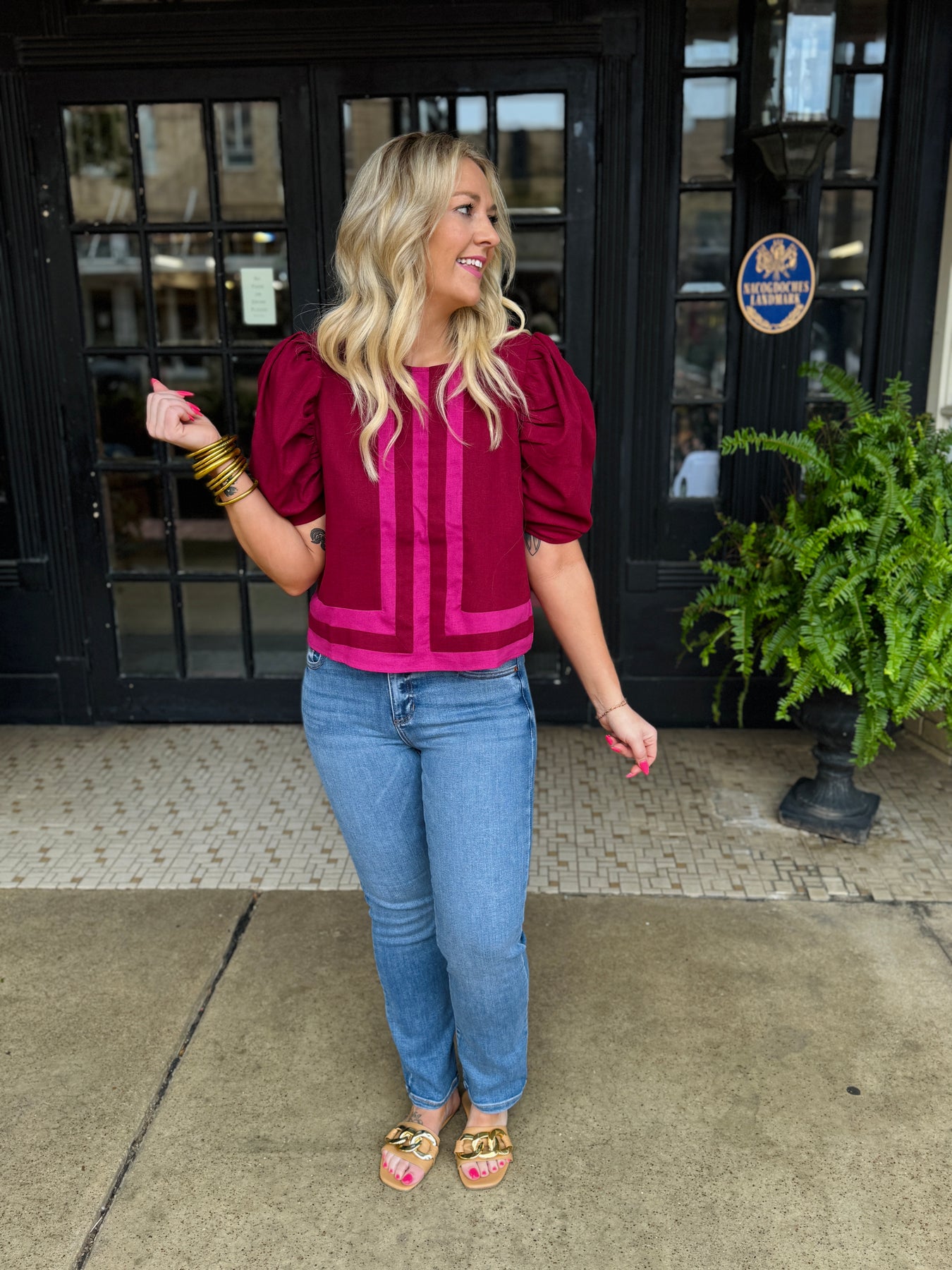 The Vineyard Stroll Top blends classic prep style with thoughtful design. Its solid, lightweight woven fabric offers comfort without heaviness, while the pleated puff sleeves add a touch of refined volume. The scalloped edge paired with a caftan-inspired high neck band collar creates a distinctive silhouette perfect for fall layering. Unlined and non-sheer, this top provides a polished look that transitions seamlessly from casual strolls to cozy gatherings.